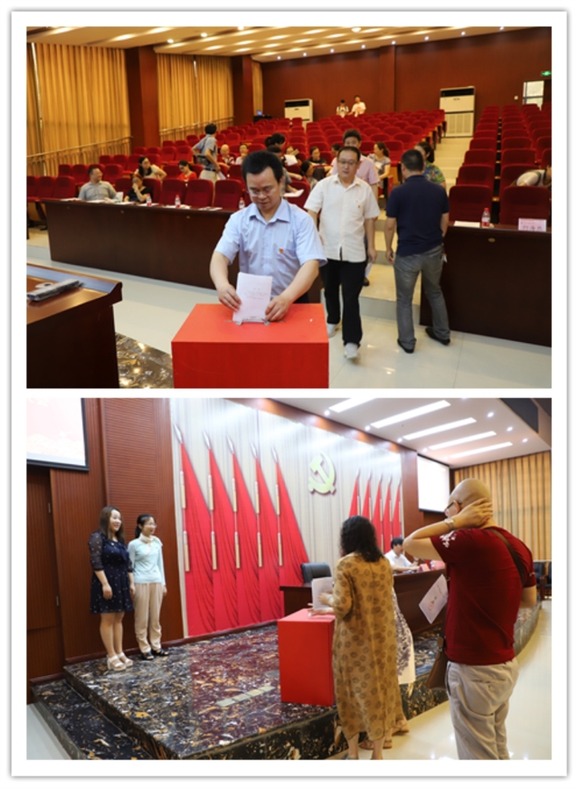 教职工们全票通过大会选举办法。接着由监票人邹雯妍、计票人刘琳瑜分发选票,教职工们填写完选票后,将其放入投票箱内。全部投票完毕,监票人和计票人计票。最后由监票人宣布投票结果。