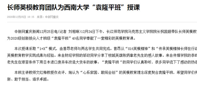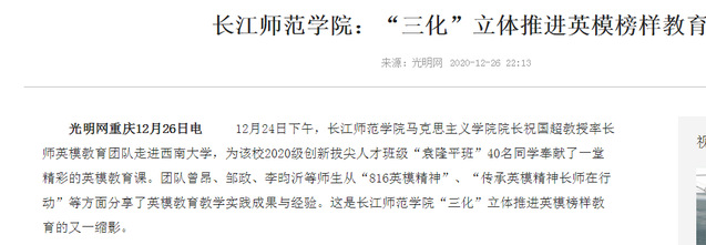 日前,我校马克思主义学院英模教育团队开启“走出去”模式,深入大中小学、企事业单位讲授英模教育课,引发强烈反响,得到了人民日报、光明网、中国新闻网、重庆日报等权威媒体的报道“点赞”。