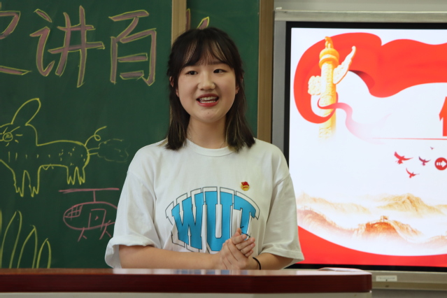 团会上,各班宣讲人全方位、多维度地带领同学们重温先烈故事,深入学习党史。他们用慷慨激昂的演讲将党史讲准、讲实、讲活,讲述党史中的“真理”故事、“人民”故事、“奋斗”故事。其中,田秋月同学讲述青年革命者陈延年的故事,感叹烈士的坚贞不屈与革命气节;李越萍同学分享宋学义的故事,赞美狼牙山壮士的奋勇前行与无私奉献;徐娟同学则融入影音等多种元素,从电影《建国大业》切入,让故事讲述鲜活生动。