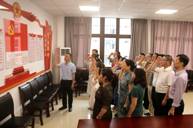 新党员曾昂在院党支部书记的带领下面向党旗进行宣誓。院党总支书记邓清华带领支部全体党员重温入党誓词。“我志愿加入中国共产党,拥护党的纲领,遵守党的章程……”铿锵有力的誓言,使党员同志们再次受到深刻的心灵洗礼,进一步增强为人民服务的光荣感、责任感和使命感,树牢全心全意为人民服务、为党和人民的教育事业奋斗终身的坚强信念。