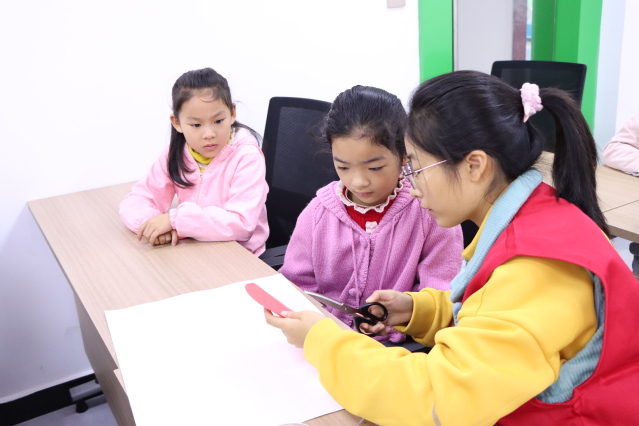 “小朋友们心中的火箭是什么样子呢?现在就请大家用彩纸做出自己心目中的火箭哦。”志愿者们带领小朋友们用纸张制作火箭模型,用手工作品展现对航空航天知识的理解。小朋友们开动脑筋、大展身手,与志愿者们携手完成一个个“纸质小火箭”的制作。大家热情高涨、干劲十足,阵阵欢声笑语在教室中回荡。
