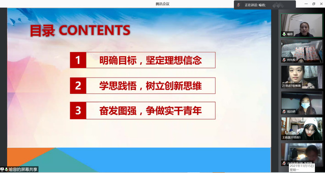 为引导同学们坚定理想信念,提高政治素养,争做新时代青年。11月15日晚,马克思主义学院以线上形式开展了“青马工程”第十六期大学生骨干培训第四场理论培训讲座。本次讲座由学院学工办辅导员喻容主讲,该期全体学员参加。