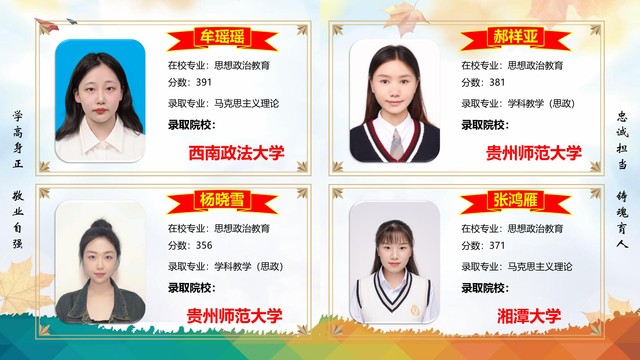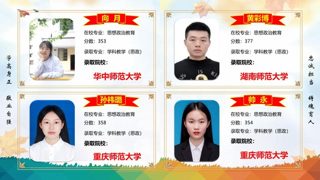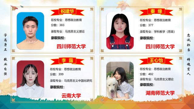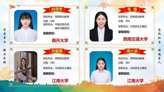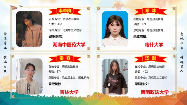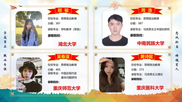 不仅如此,学院2018级思想政治教育师范本科1班更是取得了骄人成绩。该班级总人数53人,硕士研究生报考人数40人,成功录取15人。其中,“双一流”大学9人,380分高分段以上12人,考研录取学生初试平均分高达389分,考研升学率达37.5%。优异成绩的取得,离不开考研学子们奋楫笃行、寒窗苦读的求知精神,更离不开学院多措并举促考研,真抓实干建学风的后盾保障。
