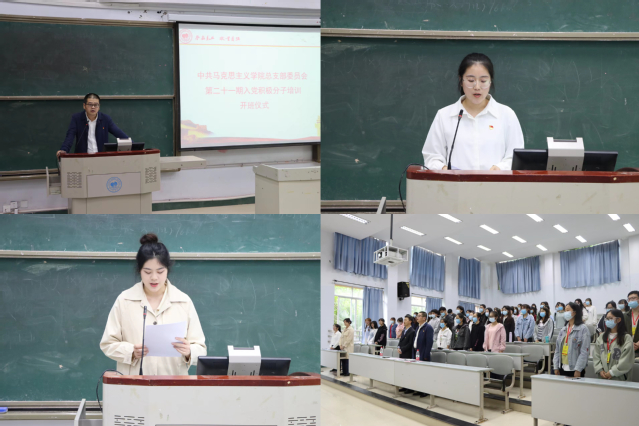 在开班仪式时,院党总支专职组织员王川介绍了学院基层党组织情况、本期培训内容并宣读了培训要求,2019级思想政治教育师范本科1班的文霞同学、2021级思想政治教育师范本科2班的蒋沁霖同学分别代表学生党员、参训学员进行了发言,开班仪式由院党建服务办主任黄娟同学主持,在国际歌声中圆满结束。开班仪式结束后,祝院长进行了以《勿忘昨天 无愧今天 不负明天——十九届六中全会精神学习》为主题的党课教学,王组织员进行了《学讲话•品典故丨理论学习要有三种境界》为主题的党课教学。