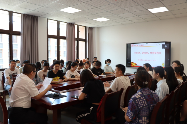 为加深发展对象对党更为深刻的认识,帮助毕业生党员扣好人生的“第一粒扣子”,筑牢严肃换届纪律防线,坚持不懈把全面从严治党向纵深推进,以实际行动和优异成绩迎接党的二十大胜利召开,马克思主义学院党总支于2022年5月以《守纪律、讲规矩,做合格党员》为题,在至静楼南楼414党员活动室对学院全体师生党员和发展对象进行了专题党课教育。