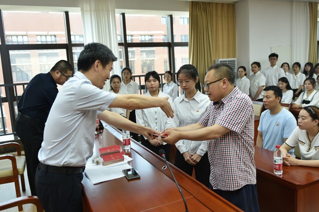 仪式伊始,全体起立,奏唱《国歌》,祝国超书记为预备党员发放《中国共产党章程》和党员徽章。