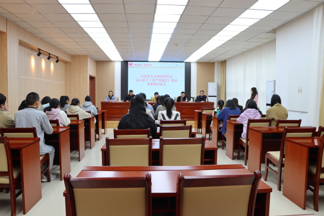 为帮助学院广大学生党员、入党积极分子提高党性修养,树立正确的入党动机,马克思主义学院党总支于2022年开展了深入学习《共产党宣言》活动。2023年4月7日下午,院党总支在至静楼南楼408英模大讲堂举行深入学习《共产党宣言》活动获奖表彰仪式,院党总支副书记付亚云出席仪式并讲话,院党总支纪检委员刘国华、专职组织员王川,活动评委、获奖人员及院党建服务办相关工作人员参加仪式,仪式由王川组织员主持。