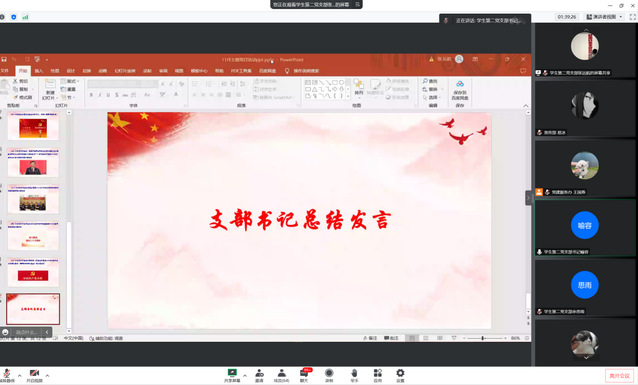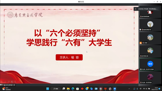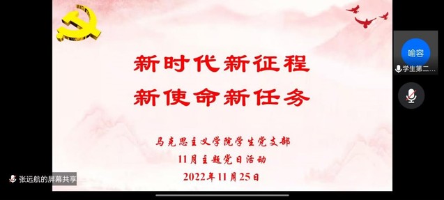 11月25日下午,马克思主义学院学生第二党支部开展“新时代新征程,新使命新任务”线上主题党日暨政治理论学习。学院学生第二党支部书记喻容及该支部全体学生党员参加。