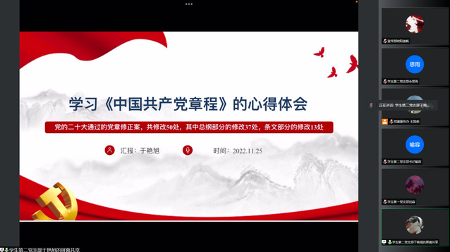 学生党员余思雨分享了关于学习中共中央关于认真学习宣传贯彻党的二十大精神决定的心得体会。学生党员于艳旭分享了关于学习《中国共产党章程》的心得体会。