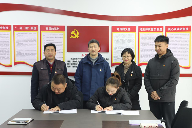 学生第二党支部书记喻容与大鹅社区党支部书记王长寿代表双方签订校地党建结对共建协议。