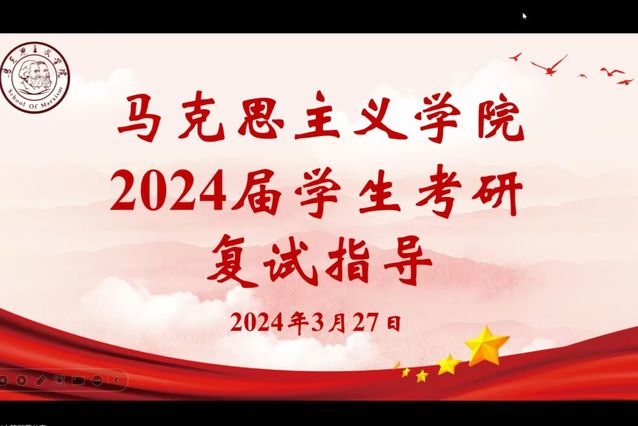 为持续推进学院2024届考研工作,帮助考研学生从容应对复试,提高复试备考效率和成功率,3月27日晚,马克思主义学院于线上开展了2024届考研复试指导会。院党委书记、院长祝国超,党委副书记付亚云及2020级全体考研复试学生参加。此次指导会由学院副院长谭晓玲主持。