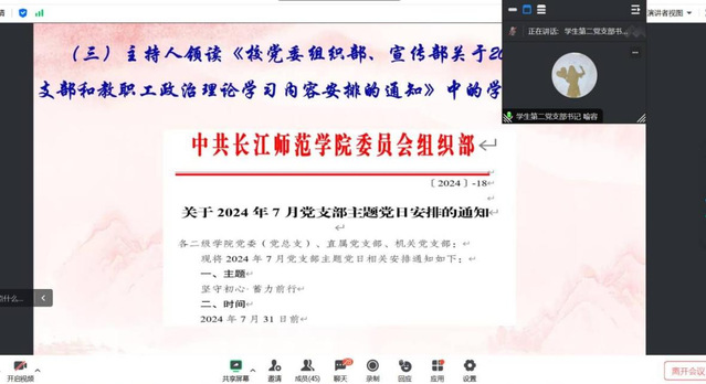 党支部书记喻容领读了《校党委组织部、宣传部关于2024年7月师生党支部和教职工政治理论学习内容安排的通知》中的学习内容。她鼓励全体党员同志要充分利用优质平台与渠道,深入研习时事政治,携手共探时代脉搏与背景,为个人综合素质的全面提升奠定坚实的知识基础。