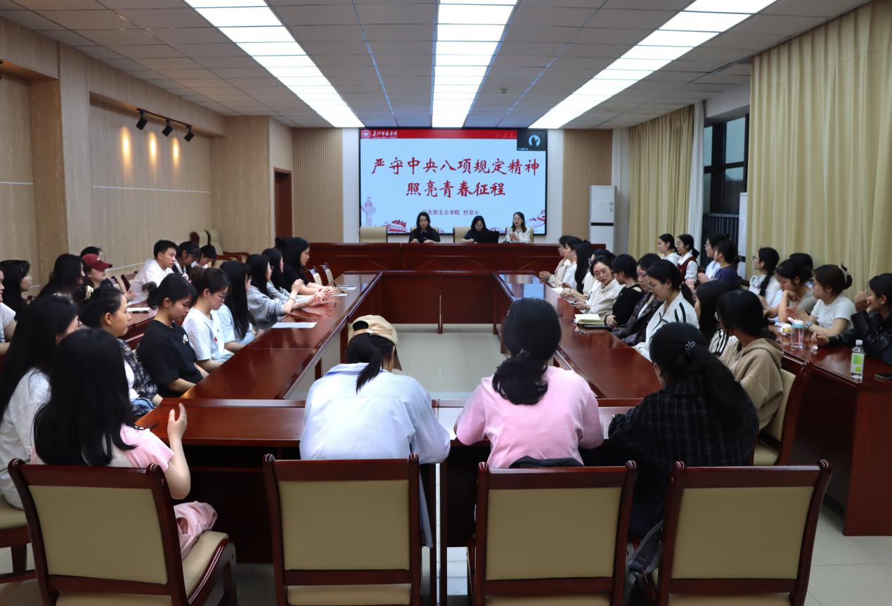院党委副书记付亚云从中央八项规定精神的重要意义、精神实质、如何深入贯彻落实三个方面进行详细解读,呼吁全体学生党员要以身作则,密切党群关系,树立榜样。