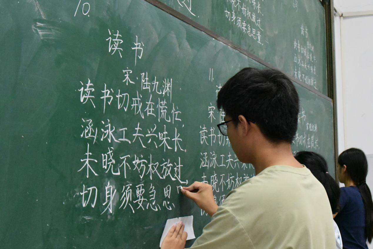 在“三笔字”比赛环节,选手们凝神静气、运笔如飞。硬笔书法刚劲挺拔,毛笔字墨韵悠长,粉笔字工整秀丽,一笔一画皆见功夫,一字一句尽展风采,扎实的书法功底跃然纸上,充分彰显出同学们扎实的师范生基本功。