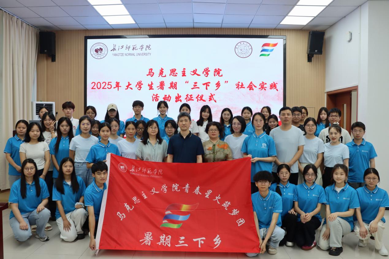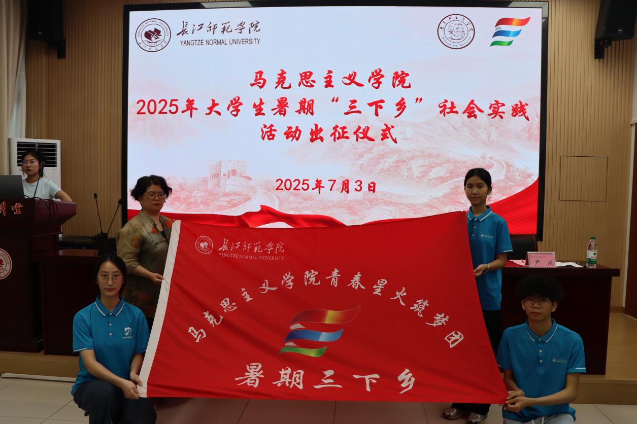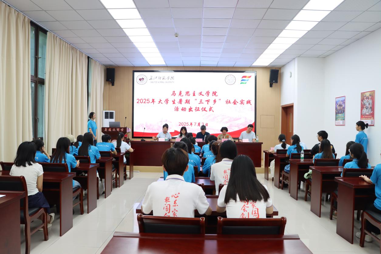 为深入学习贯彻习近平新时代中国特色社会主义思想和党的二十大精神,助力乡村振兴,真正实现在社会大课堂中受教育、长才干、做贡献,7月3日晚,马克思主义学院在至静南楼二楼英模大讲堂举行2025年暑期“三下乡”社会实践活动出征仪式。学院党委书记、院长祝国超,副院长谭晓玲,党委副书记付亚云出席,学院办公室主任李伶俐,学院专业课教师姜惠南、甯代毅,学院“青春星火筑梦团”指导老师尹浩、闫佳琪、喻容及全体团队成员参加。仪式由团队指导老师杨晓艳主持。