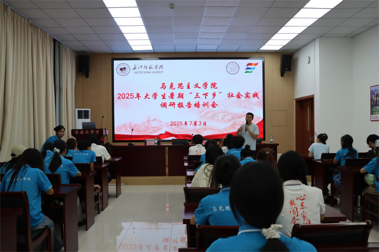 为加强实践育人成效,进一步推动理论学习与实践探索深度融合,7月3日晚,马克思主义学院在至静南楼二楼英模大讲堂开展了2025年大学生暑期“三下乡”社会实践调研报告培训会。本次培训会由学院毛泽东思想和中国特色社会主义理论体系概论教研室主任尹浩作培训和分享,学院学工办辅导员喻容及全体志愿者参加。