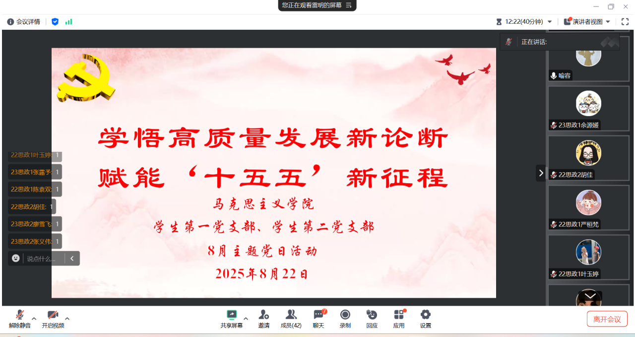 822日晚,马克思主义学院学生第二党支部开展“学悟高质量发展新论断赋能‘十五五’新征程”线上主题党日暨政治理论学习。学院学生第二党支部书记喻容,纪检委员、组织委员邹雯妍,宣传委员闫佳琪及该支部全体学生党员参加。