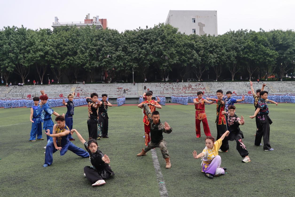 武术方阵的表演精彩非凡。他们手持刀、棍、长枪分列数队,随着指令整齐起势:挥刀时寒光闪烁,劈、砍动作刚劲有力;舞棍时棍身翻飞,转、扫招式利落连贯;耍长枪时气势如虹,刺、扎姿势沉稳扎实,展现出青年学子昂扬向上的精神风貌。