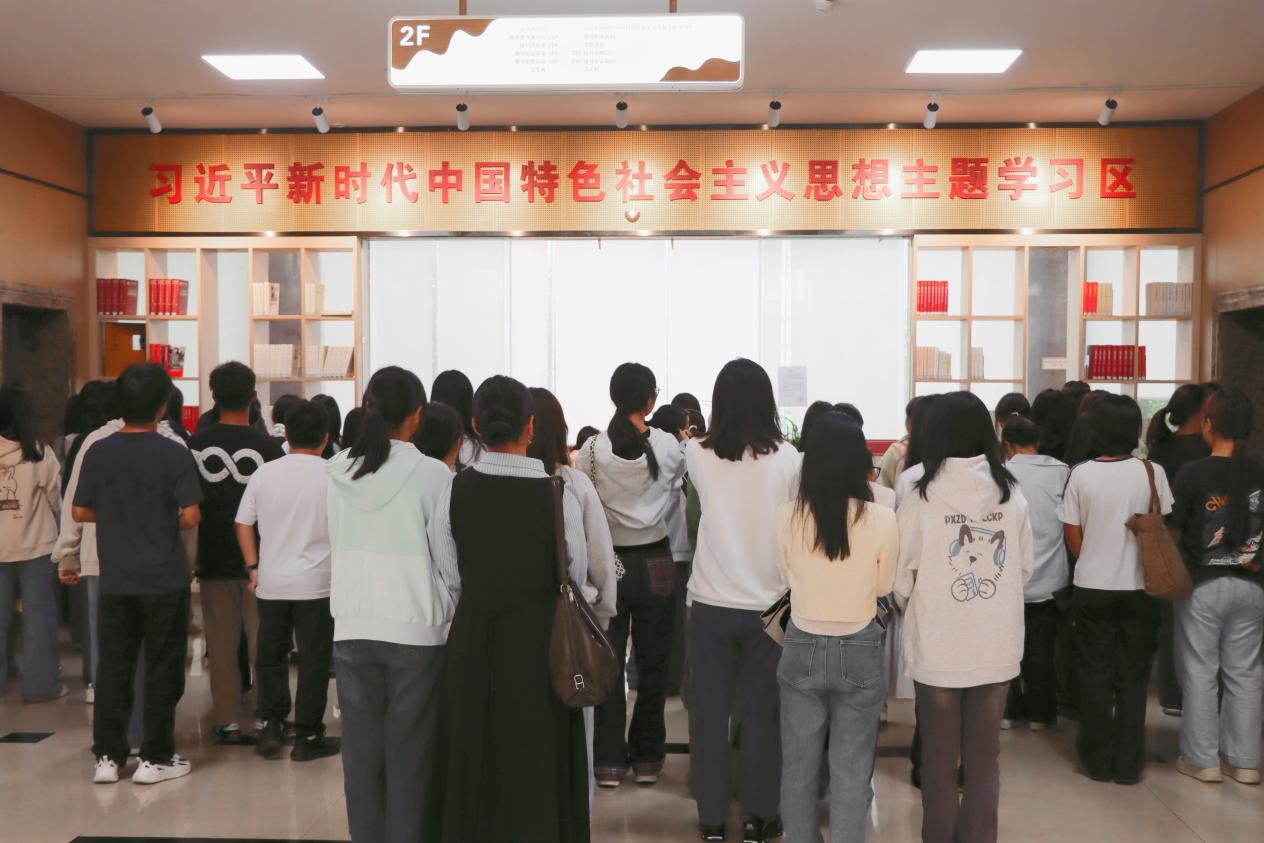 参观过程中,图书馆海量的文献资源与优良的学习空间令2025级新生们印象深刻。其中,习近平新时代中国特色社会主义思想主题学习区与新书角成为参观亮点。该学习区提供习近平新时代中国特色社会主义思想学习提纲、党史教育资料及总书记原著等学习资源。新书角则围绕社科类和科技类图书,集中陈列了近期入藏的经典与热门读物,供广大师生阅读。