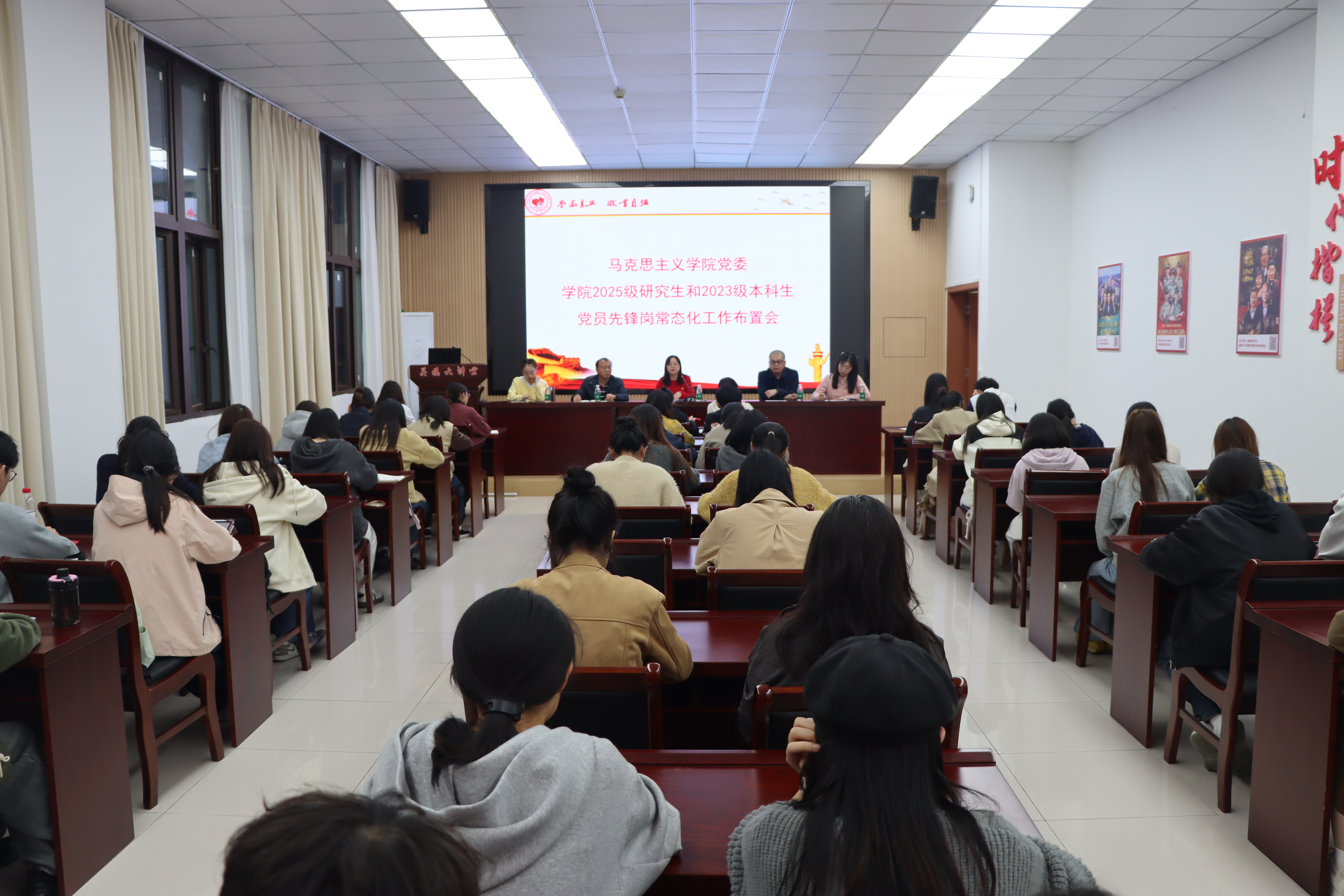 为加强学院的学生党员党性教育和实践锤炼,充分发挥党员先锋模范作用,更好地组织群众、宣传群众、凝聚群众、服务群众,强化落实预防大学生入党动机功利化长效机制,深入推进院党委校级第三批“党建工作标杆学院”建设、第三批党建活动品牌“英模领航”项目建设,马克思主义学院党委于2025年10月24日下午在至静楼南楼二楼英模大讲堂召开了学院2025级研究生和2023级本科生党员先锋岗常态化工作布置会。院党委副书记付亚云出席会议并讲话。