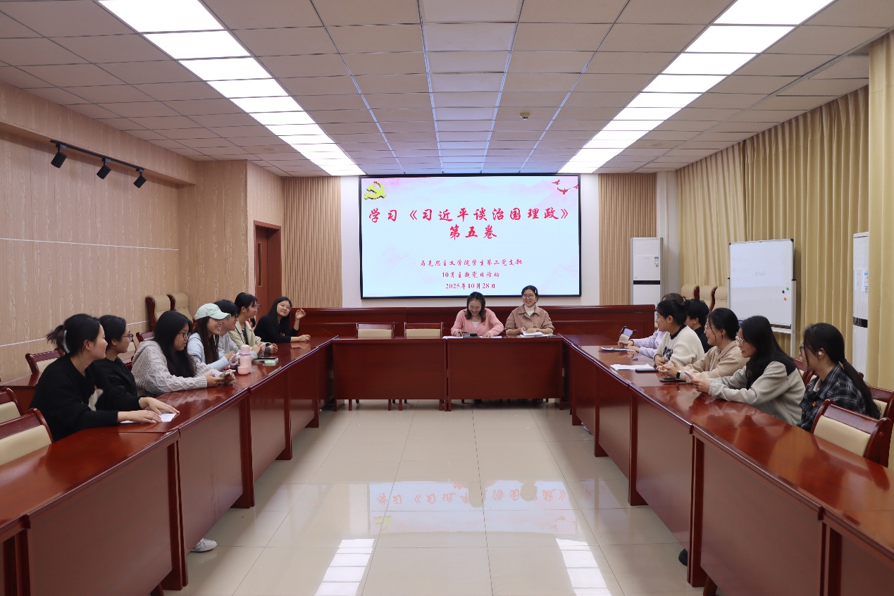 10月28日下午,马克思主义学院学生第二党支部在至静南楼408党员活动室开展了“学习《习近平谈治国理政》第五卷”主题党日暨政治理论学习。学院学生第二党支部书记喻容,宣传委员闫佳琪及该支部全体学生党员参加。