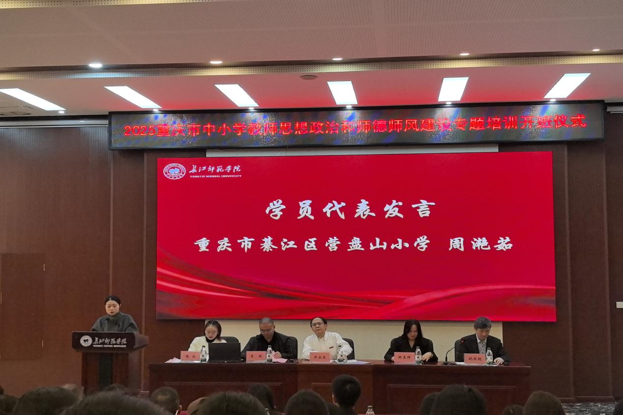 重庆市綦江区营盘山小学周滟茹作为学员代表发言。她分享了自己深耕小学教育的热忱初心与对专业成长的迫切追求,表达了她将以此次培训为契机锤炼师德、精进学识,努力成为兼具扎实学识与高尚师德的“经师”与“人师”的坚定决心。