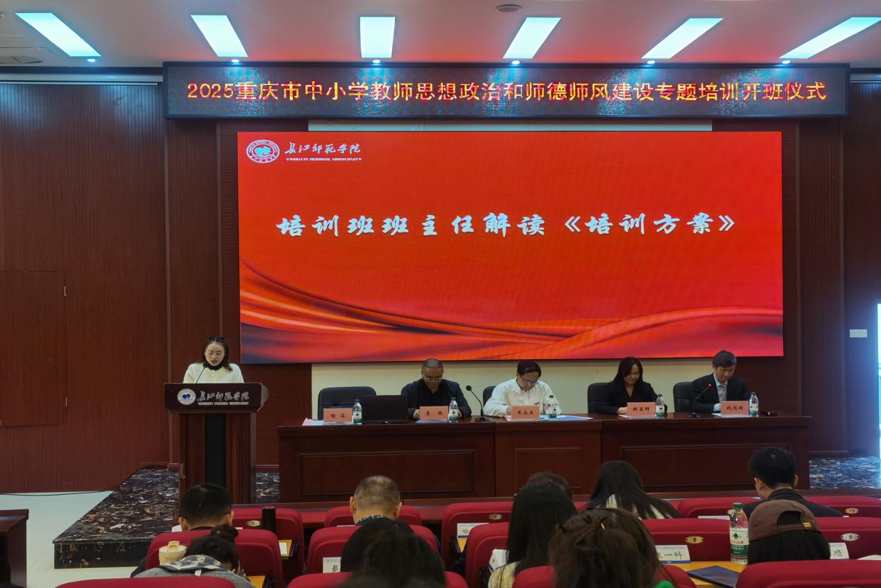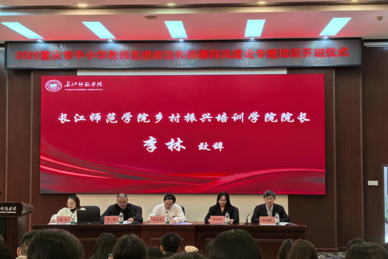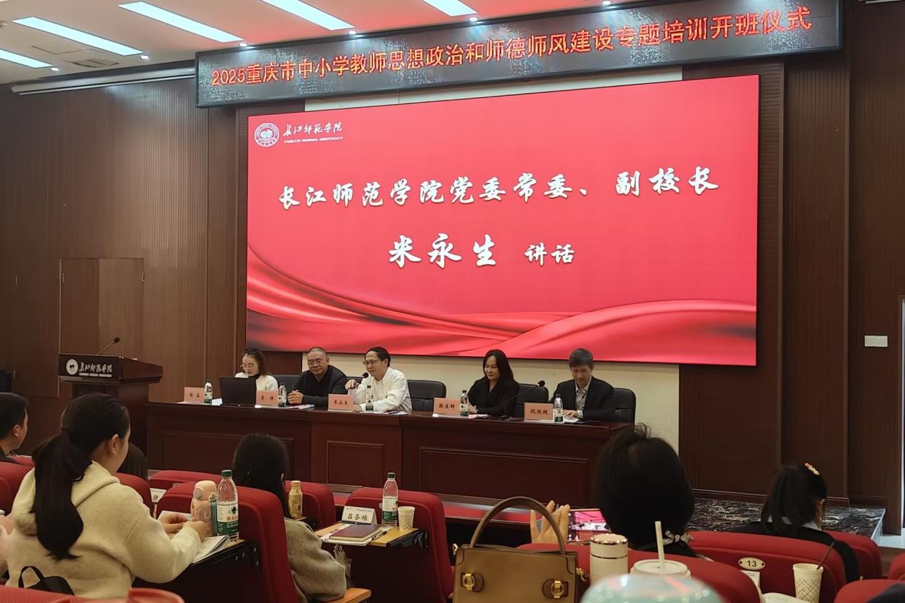 11月3日上午,重庆市2025年中小学教师思想政治和师德师风建设专题培训班(小学学科教师)开班式在我校摇光学术厅举行。长江师范学院党委常委、副校长米永生,中国地质大学(武汉)教授、长江学者韩美群,乡村振兴培育学院院长李林出席会议,重庆市2025年中小学教师思想政治和师德师风建设专题培训班全体学员参加。本次开班式由马克思主义学院党委书记、院长祝国超主持。