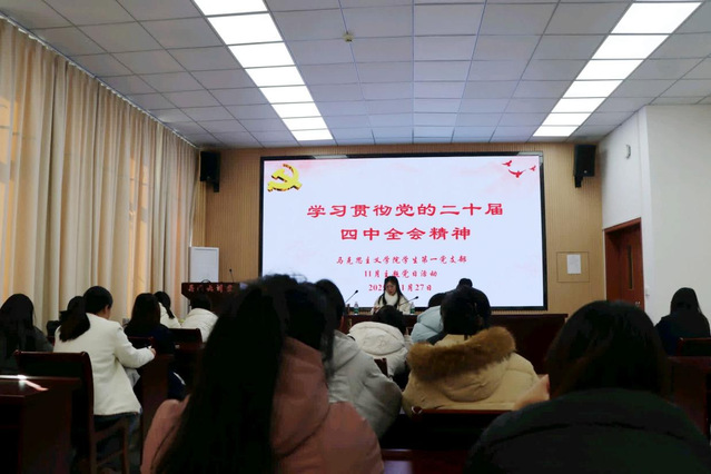 学院学生第一党支部为深入推进“清廉支部”建设,11月27日下午,马克思主义学院学生第一党支部与机器人工程学院匠心达人学生党支部在至静南楼英模大讲堂开展了“学习贯彻党的二十届四中全会精神”联合主题党日暨政治理论学习,该党支部全体党员参加,本次主题党日活动学院党委副书记付亚云、机器人工程学院匠心达人学生党支部李春光出席,学院学生第一党支部书记杨晓艳主持。