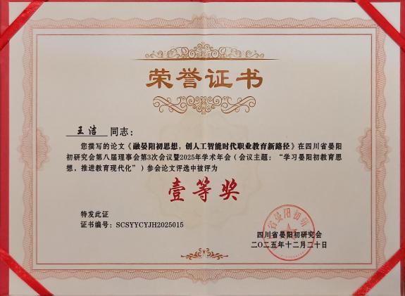 本次年会征集的学术成果中,经严格评审,刘河燕提交的专题论文视角新颖、论证扎实,荣获大会特等奖。我院研究生王洁提交的论文《融晏阳初思想,创人工智能时代职业教育新路径》获评一等奖。