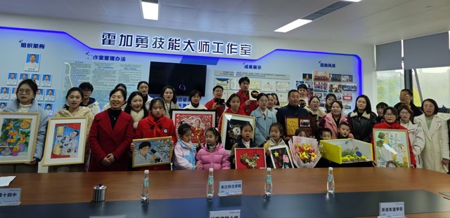 稍后,课堂移至重庆市霍加勇药物制剂工市级首席技能大师工作室。各学段师生依次向霍加勇献上以霍加勇及其企业文化为创意主题的师生创作书画对联、金手模、手工等系列文创;多学段师生齐声献唱《学习雷锋好榜样》《最美劳动人》两首歌曲;稍后,各学段师生在大学老师陪伴下访谈霍加勇,学生基于各自学段创新学习、品德养成、读书爱好培养、劳动习惯、人际交往、实践锻炼等困惑,请求霍老师以其自身在大中小学及创业时期成长成才经历与故事“示范”回应,学校老师持续追问,现场助力访谈劳模成果的再丰富。