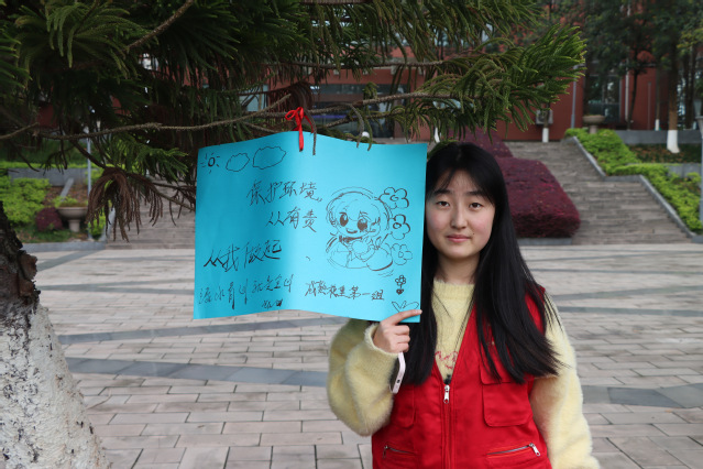 清扫结束后,志愿者们在硬纸片上写下有关保护环境的祝语,并将其悬挂于鉴湖旁,以此激励同学们积极传播并践行绿色环保理念。