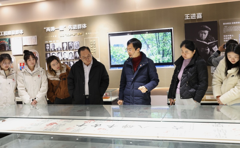 2025年9月29日,重庆市社科联党组成员、副主席唐旺虎参观长江师范学院英模教育馆,长江师范学院副校长吴文...